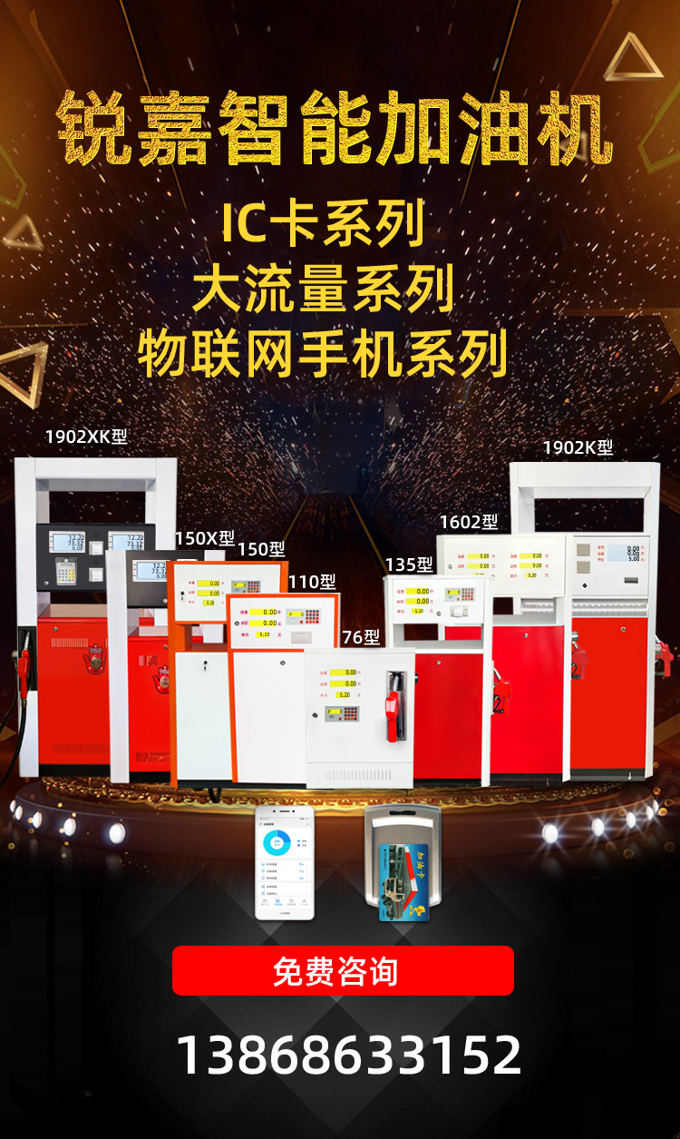 銳嘉IC卡加油機160K型是一款加油站防爆汽油雙槍插卡加油機,可加柴油和汽油,750W大功率,流量每分鐘可達60L-100L,加油機內部采用正星同款流量計和防爆組合泵裝置,安全更放心!
